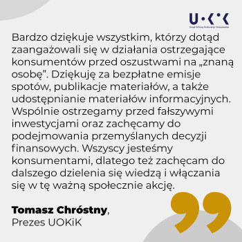– Bardzo dziękuje wszystkim, którzy dotąd zaangażowali się w działania ostrzegające konsumentów przed oszustwami na „znaną osobę”. Dziękuję za bezpłatne emisje spotów, publikacje materiałów, a także udostępnianie materiałów informacyjnych. Wspólnie ostrzegamy przed fałszywymi inwestycjami oraz zachęcamy do podejmowania przemyślanych decyzji finansowych. Wszyscy jesteśmy konsumentami, dlatego też zachęcam do dalszego dzielenia się wiedzą i włączania się w tę ważną społecznie akcję - mówi Prezes UOKiK Tomasz Chróstny.