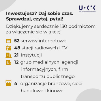 Superzyskowne, pozbawione ryzyka inwestycje w waluty, kryptoaktywa, weksle, akcje lub obligacje? Reklamy obiecujące duży zysk z wizerunkiem znanych osób lub firm użytym bez ich wiedzy i zgody? Jeden klik i zysk w mig? Niestety, to może być oszustwo, dlatego Prezes UOKiK apeluje: Inwestujesz? Daj sobie czas. Sprawdzaj, czytaj, pytaj! i zaprasza do włączania się w kampanię.