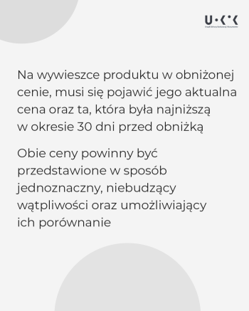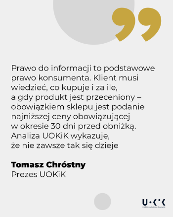 – Prawo do informacji to podstawowe prawo konsumenta. Klient musi wiedzieć, co kupuje i za ile, a gdy produkt jest przeceniony – obowiązkiem sklepu jest podanie najniższej ceny obowiązującej w okresie 30 dni przed obniżką. Analiza UOKiK wykazuje, że nie zawsze tak się dzieje. Nieprawidłowe oznaczanie obniżek lub jego brak utrudnia porównanie cen i powoduje, że konsument nie może ocenić, czy ma do czynienia z rzeczywistą promocją i czy zakup jest dla niego korzystny – mówi Prezes UOKiK Tomasz Chróstny.