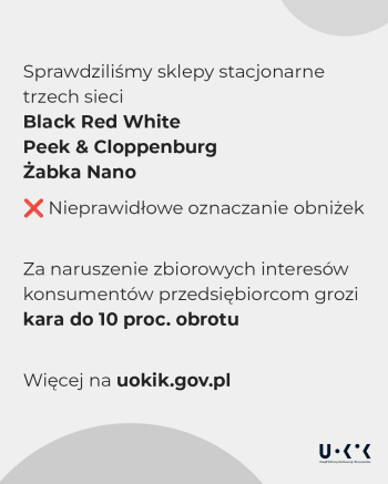 - Brak informacji o najniższej cenie, która obowiązywała w okresie 30 dni przed obniżką – takie zarzuty postawił Prezes UOKiK sklepom Black Red White, Żabka Nano, Peek & Cloppenburg.