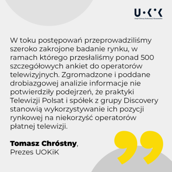 – W toku postępowań przeprowadziliśmy szeroko zakrojone badanie rynku, w ramach którego przesłaliśmy ponad 500 szczegółowych ankiet do operatorów telewizyjnych. Zgromadzone i poddane drobiazgowej analizie informacje nie potwierdziły podejrzeń, że praktyki Telewizji Polsat i spółek z grupy Discovery stanowią wykorzystywanie ich pozycji rynkowej na niekorzyść operatorów płatnej telewizji – mówi Prezes UOKiK Tomasz Chróstny.