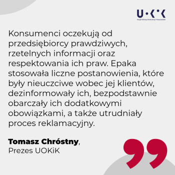 - Konsumenci oczekują od przedsiębiorcy prawdziwych, rzetelnych informacji oraz respektowania ich praw. Epaka stosowała liczne postanowienia, które były nieuczciwe wobec jej klientów, dezinformowały ich, bezpodstawnie obarczały ich dodatkowymi obowiązkami, a także utrudniały proces reklamacyjny. Ponadto spółka stosowała klauzule dające jej swobodę modyfikacji umowy o prowadzenie indywidualnego konta w swoim serwisie, co jest niedopuszczalne – mówi Prezes UOKiK Tomasz Chróstny.