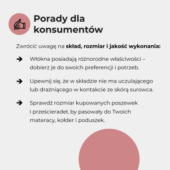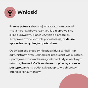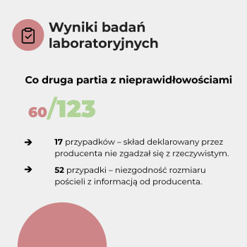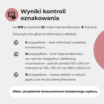 - Aż w 50% zbadanych produktów wykryliśmy nieprawidłowości: niezgodność deklarowanego składu materiału lub rozmiaru z rzeczywistością. Kupując pościel, sprawdź jej skład i upewnij się, czy nie zawiera uczulającej lub drażniącej Cię substancji.