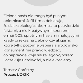 – Zielone hasła nie mogą być pustymi obietnicami. Jeśli firma deklaruje, że działa ekologicznie, musi to potwierdzić faktami, a nie kreatywnym liczeniem emisji CO₂, sprytnymi hasłami malującymi każdy przekaz na zielono czy akcjami, które tylko pozornie wspierają środowisko. Konsument ma prawo wiedzieć, co naprawdę kryje się za jego wyborem i oczekuje uczciwości, a nie ekościemy – wyjaśnia Prezes UOKiK Tomasz Chróstny.