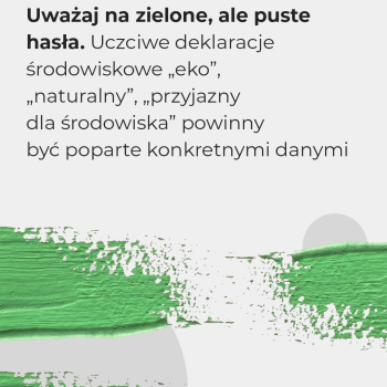 - Uważaj na zielone, ale puste hasła – uczciwe deklaracje środowiskowe „eko”, „naturalny”, „przyjazny dla środowiska” powinny być poparte konkretnymi danymi. Zwracaj uwagę, czy przedsiębiorca podaje: nazwy materiałów, procentowy udział składników, źródło pochodzenia. Ich brak może świadczyć o greenwashingu.