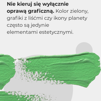 - Nie kieruj się wyłącznie oprawą graficzną. Kolor zielony, grafiki z liśćmi czy ikony planety często są jedynie elementami estetycznymi sugestywnie wpływającymi na percepcję – nie dowodem na ekologiczność produktu.