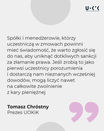 – Program łagodzenia kar jest dla nas ważnym instrumentem, który pozwala nam na zdobycie dowodów na istnienie niedozwolonego porozumienia. Wyjaśnienia w sprawie leniency to kolejny dokument pokazujący, w jaki sposób działamy i jak stosujemy przepisy prawa. Jego adresatami są przede wszystkim prawnicy reprezentujący przedsiębiorców. Natomiast spółki i menedżerowie, którzy uczestniczą w zmowach, powinni mieć świadomość, że warto zgłosić się do UOKiK, aby uniknąć dotkliwych sankcji za złamanie prawa – mówi Prezes UOKiK Tomasz Chróstny.