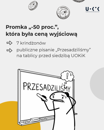 - Promocja „-50 proc.”, która była ceną wyjściową – 7 krindżonów i konieczność napisania 100 razy „Przesadziliśmy” na tablicy przed siedzibą UOKiK.