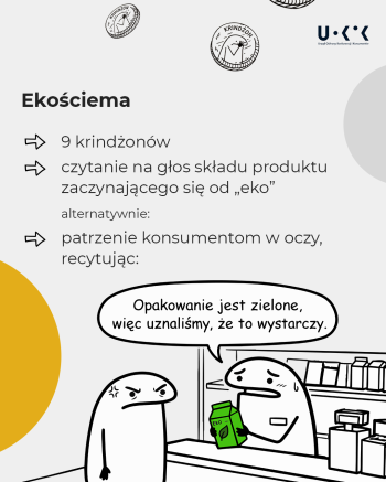 - Ekościema – 9 krindżonów i obowiązek przeczytania na głos składu produktu zaczynającego się od „eko”, alternatywnie patrzenie konsumentom w oczy, recytując: „Opakowanie jest zielone, więc uznaliśmy, że to wystarczy”.