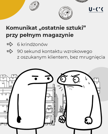 - Komunikat „ostatnie sztuki” przy pełnym magazynie – 6 krindżonów i 90 sekund kontaktu wzrokowego z oszukanym, zdenerwowanym klientem, bez mrugnięcia.