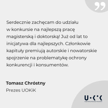 – Serdecznie zachęcam do udziału w konkursie na najlepszą pracę magisterską i doktorską! To szansa na zdobycie nagród finansowych, wydawnictwo w ramach Biblioteki UOKiK i możliwość poznania kulis Urzędu. Już od lat to inicjatywa dla najlepszych. Członkowie kapituły premiują autorskie i nowatorskie spojrzenie na problematykę ochrony konkurencji i konsumentów. Tegoroczna szczególna edycja kumuluje konkursowe kategorie, czyli prace magisterskie i rozprawy doktorskie. Z ogromną ciekawością czekam na polsko- lub anglojęzyczne opracowania – mówi Prezes UOKiK Tomasz Chróstny.
