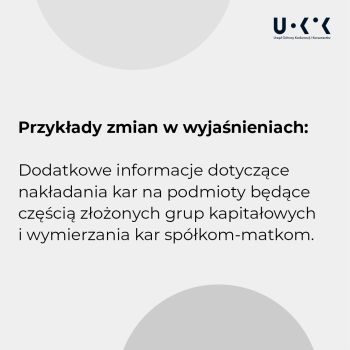 Zmiana wyjaśnień wynika m.in. z nowelizacji przepisów w związku z implementacją ww. dyrektywy. Wyjaśnienia zawierają m.in. dodatkowe informacje dotyczące nakładania kar na podmioty będące częścią złożonych grup kapitałowych i wymierzania kar spółkom-matkom. Będzie to szczególnie istotne w przypadku postępowań przeciwko przedsiębiorcom będącym członkami międzynarodowych grup kapitałowych. Ponadto wyjaśnienia precyzują, jaki wpływ na wysokość kary ma m.in. długość naruszenia, rodzaj praktyki oraz skutki rynkowe. Dokument wymienia okoliczności łagodzące, takie jak współpraca z UOKiK w trakcie postępowania, oraz obciążające, np. rola lidera porozumienia.