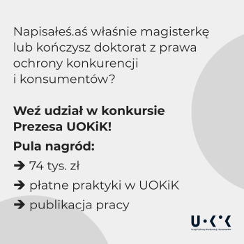 Summer Camp to nie jedyny projekt UOKiK skierowany do studentów. Od lat prowadzimy konkursy na prace magisterskie i doktorskie. W ubiegłorocznej edycji przyznano 6 nagród i 1 wyróżnienie specjalne autorom najlepszych prac. Właśnie trwa 15. edycja konkursu Prezesa UOKiK na najlepszą pracę magisterską w obszarze ochrony konkurencji oraz 13. edycja w obszarze ochrony konsumentów. Zgłoszenia można nadsyłać do 30.11.2023. Więcej o zasadach konkursu, znajdziesz na stronie Urzędu.