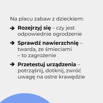 - Za bezpieczeństwo placu zabaw odpowiada jego właściciel lub zarządca. Rodzice i opiekunowie również muszą być czujni.