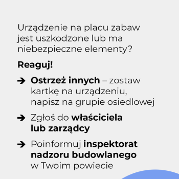 Informacje dla zarządców i inwestorów, np. o obowiązkowych przeglądach placów zabaw, są dostępne także na stronie Głównego Urzędu Nadzoru Budowlanego gunb.gov.pl.