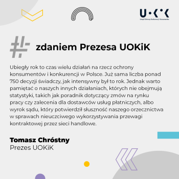 – Ubiegły rok to czas wielu działań na rzecz ochrony konsumentów i konkurencji w Polsce. Już sama liczba ponad 750 decyzji świadczy, jak intensywny był to rok. Jednak warto też pamiętać o naszych innych działaniach, których nie obejmują statystyki. W obszarze ochrony konkurencji chciałbym zwrócić uwagę na poradnik dotyczący zmów na rynku pracy. Bardzo istotny był również wyrok sądu, który potwierdził słuszność naszego orzecznictwa w sprawach nieuczciwego wykorzystywania przewagi kontraktowej przez sieci handlowe. W pionie ochrony konsumentów ważne było wydanie zbioru zaleceń dla dostawców usług płatniczych – podsumowuje Prezes UOKiK Tomasz Chróstny.