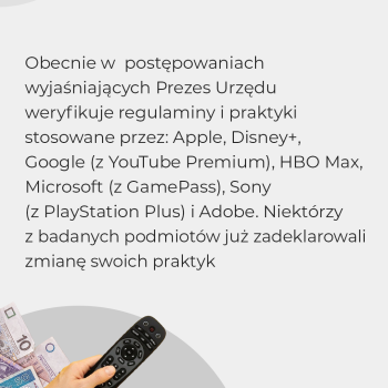 Obecnie w postępowaniach wyjaśniających Prezes Urzędu weryfikuje regulaminy i praktyki stosowane przez: Apple, Disney+, Google (z YouTube Premium), HBO Max, Microsoft (z GamePass), Sony (z PlayStation Plus) i Adobe. Niektórzy z badanych podmiotów już zadeklarowali zmianę swoich praktyk.
