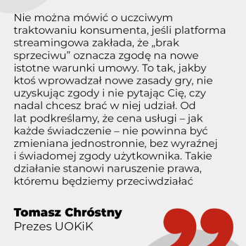 – Nie można mówić o uczciwym traktowaniu konsumenta, jeśli platforma streamingowa zakłada, że „brak sprzeciwu” oznacza zgodę na nowe istotne warunki umowy. To tak, jakby ktoś wprowadzał nowe zasady gry, nie uzyskując zgody i nie pytając Cię, czy nadal chcesz brać w niej udział. Od lat podkreślamy, że cena usługi – jak każde świadczenie – nie powinna być zmieniana jednostronnie, bez wyraźnej i świadomej zgody użytkownika. Takie działanie stanowi naruszenie prawa, któremu będziemy przeciwdziałać – mówi Prezes UOKiK Tomasz Chróstny.