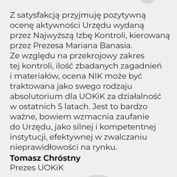 – Kontrola trwała blisko 5 miesięcy i obejmowała bardzo szeroki zakres działalności UOKiK z ostatnich 5 lat. Doceniam ogrom pracy, którą wykonali kontrolerzy NIK, na których wniosek przygotowaliśmy i przekazaliśmy ponad 20 tys. stron dokumentów, nie mówiąc o setkach stron wyjaśnień, zestawień i statystyk. W tym czasie, jako zespół UOKiK, nie zwolniliśmy tempa w prowadzonych sprawach – zaznacza Prezes UOKiK Tomasz Chróstny.