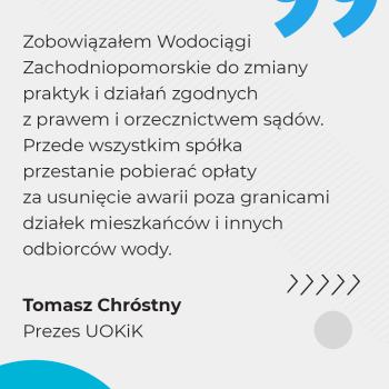 – Zobowiązałem Wodociągi Zachodniopomorskie do zmiany praktyk i działań zgodnych z prawem i orzecznictwem sądów. Przede wszystkim spółka przestanie pobierać opłaty za usunięcie awarii poza granicami działek mieszkańców i innych odbiorców wody – mówi Prezes UOKiK Tomasz Chróstny.