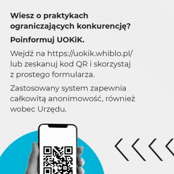 Przypominamy, że UOKiK prowadzi program pozyskiwania informacji od anonimowych sygnalistów. Chcesz poinformować UOKiK o praktykach ograniczających konkurencję? Wejdź na https://uokik.whiblo.pl/ lub zeskanuj kod QR, który znajdziesz poniżej i skorzystaj z prostego formularza. Zastosowany system zapewnia całkowitą anonimowość, również wobec Urzędu.