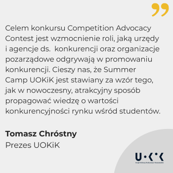 - Celem konkursu Competition Advocacy Contest jest wzmocnienie roli, jaką urzędy i agencje do spraw konkurencji oraz organizacje pozarządowe odgrywają w promowaniu konkurencji. Odbywa się to poprzez nagradzanie oraz prezentowanie najciekawszych i najbardziej skutecznych tego typu inicjatyw. Cieszy nas, że Summer Camp UOKiK jest stawiany za wzór tego, jak w nowoczesny, atrakcyjny sposób propagować wiedzę o wartości konkurencyjności rynku wśród studentów – mówi Prezes UOKiK Tomasz Chróstny.
