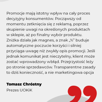 – Promocje mają istotny wpływ na cały proces decyzyjny konsumentów. Począwszy od momentu zetknięcia się z reklamą, poprzez skupienie uwagi na określonych produktach w sklepie, aż po finalny wybór produktu. Zniżka działa jak magnes, a znak „%” buduje automatyczne poczucie korzyści i silniej przyciąga uwagę niż zwykły opis promocji. Jeśli jednak komunikat jest nieczytelny, klient może zostać wprowadzony w błąd. Przejrzystość leży po stronie sprzedawców. Transparentne zasady to dziś konieczność, a nie marketingowa opcja – mówi Prezes UOKiK Tomasz Chróstny.