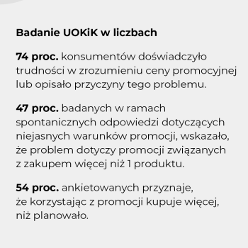 Chociaż promocje przyciągają, nie jest oczywiste, ile dzięki nim „oszczędzamy”. 74 proc. Polaków deklaruje, że miało trudności ze zrozumieniem zasad promocji lub wskazuje źródła tego problemu. Wśród najczęściej wskazywanych spontanicznie przyczyn respondenci wymieniali promocje wymagające zakupu więcej niż jednej sztuki, w tym oferty typu „2+1” lub „drugi produkt tańszy o 50 proc”. O braku zrozumienia zasad tego typu promocji świadczą też konkretne wypowiedzi respondentów m.in.: „Zazwyczaj wprowadzają mnie w błąd akcje promocyjne opierające się na wielosztukach. Jest to spowodowane tym, że nie do końca czytelna na pierwszy rzut oka jest cena jednostkowa za produkt, a obniżona kwota jest mocno wyeksponowana” oraz „Dużymi literami była napisana cena za w sytuacji, gdy kupuje się 2 produkty, a małymi z boku była napisana cena za jeden produkt. Przy zakupie byłam zdziwiona, że mam zapłacić więcej, niż wskazywała na to cena wypisana dużymi literami”. Badanie zwróciło uwagę również na problem przekreślonych cen pozbawionych wyjaśnienia. Gdy przy przekreślonej kwocie brakuje jasnego opisu (na przykład „najniższa cena z 30 dni przed obniżką”), znaczna część kupujących nie potrafi wskazać, co właściwie oznacza taka wartość.