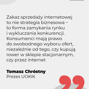 – Zakaz sprzedaży internetowej to nie strategia biznesowa - to forma zamykania rynku i wykluczania konkurencji. Konsumenci mają prawo do swobodnego wyboru ofert, niezależnie od tego, czy kupują rower w sklepie stacjonarnym, czy przez internet – mówi Prezes UOKiK Tomasz Chróstny.