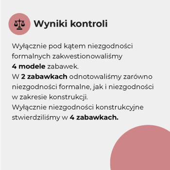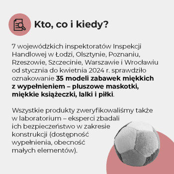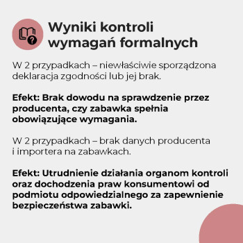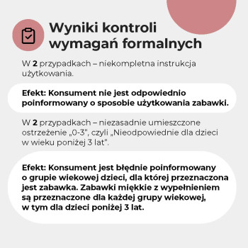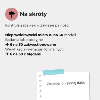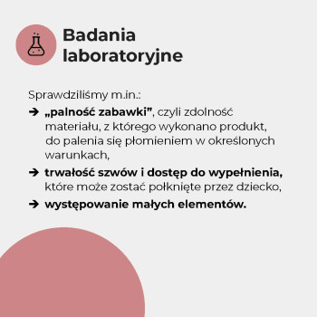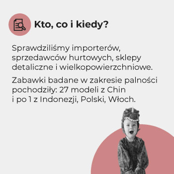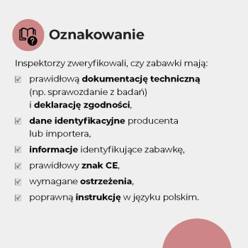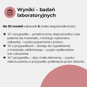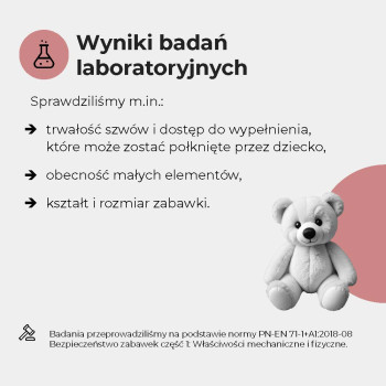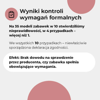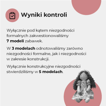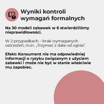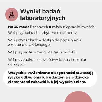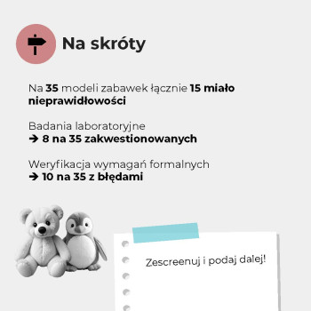 - Sprawdziliśmy oznakowanie, trwałość szwów, obecność zbyt małych elementów oraz palność niektórych zabawek. Więcej niż 1/3 miała nieprawidłowości formalne lub konstrukcyjne.