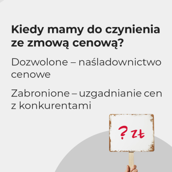 Przypominamy, że każdy przedsiębiorca powinien samodzielnie kształtować ceny w oparciu o własny rachunek ekonomiczny. Chociaż dozwolone jest naśladownictwo cenowe, czyli obserwowanie cen innych podmiotów i na tej podstawie tworzenie własnej oferty, to zabronione jest uzgadnianie i koordynowanie swoich cen z konkurentami. Takie działanie stanowi niedozwoloną prawem zmowę cenową.