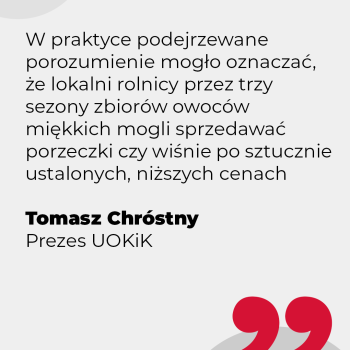 – W praktyce podejrzewane porozumienie mogło oznaczać, że lokalni rolnicy przez trzy sezony zbiorów owoców miękkich mogli sprzedawać porzeczki czy wiśnie po sztucznie ustalonych, niższych cenach – mówi Prezes UOKiK Tomasz Chróstny.