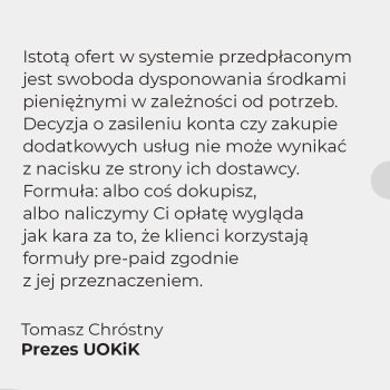 Istotą ofert w systemie przedpłaconym jest swoboda dysponowania środkami pieniężnymi w zależności od potrzeb. Decyzja o dodatkowym zasileniu konta czy zakupie dodatkowych usług nie może wynikać z nacisku ze strony ich dostawcy.