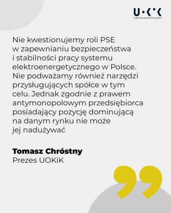 - Nie kwestionujemy roli PSE w zapewnianiu bezpieczeństwa i stabilności pracy systemu elektroenergetycznego w Polsce ani nie podważamy narzędzi przysługujących w tym celu operatorowi systemu przesyłowego. Sprawdzamy, czy instrument w postaci mechanizmu redysponowania stosowany był w transparentny i niedyskryminacyjny sposób – mówi Prezes UOKiK Tomasz Chróstny.