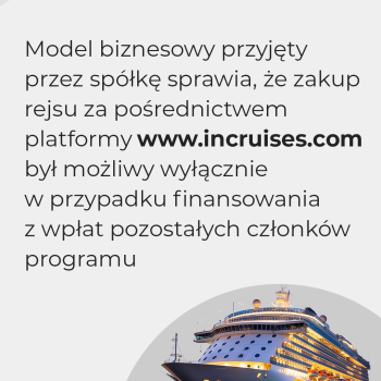 - Model biznesowy przyjęty przez spółkę sprawia, że zakup rejsu za pośrednictwem platformy www.incruises.com był możliwy wyłącznie w przypadku finansowania z wpłat pozostałych członków programu.