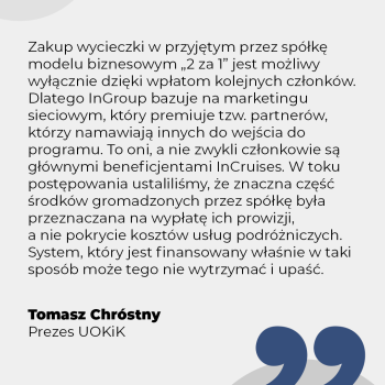 – W przypadku programu InCruises zachodzą wszystkie przesłanki do uznania, że jest to zakazany system konsorcyjny. Spółka InGroup prowadząca serwis incruises.com utworzyła grupę z udziałem konsumentów w celu finansowania zakupu produktów. Do tego w całości dysponuje pieniędzmi z comiesięcznych wpłat Członków Klubu Rejsowego InCruises. Zakup wycieczki w przyjętym przez spółkę modelu biznesowym „2 za 1” jest możliwy wyłącznie dzięki wpłatom pozostałych członków. System, który jest finansowany właśnie w taki sposób, może tego nie wytrzymać i upaść – mówi Prezes UOKiK Tomasz Chróstny.