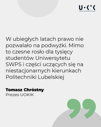 – W płatnej formie edukacji cena gra kluczową rolę. Dla osób zawierających umowę z uczelnią niezbędna jest wiedza o tym, jakie są warunki odpłatności za studia, które pozwolą im na uzyskanie planowanego tytułu zawodowego. W ubiegłych latach prawo nie pozwalało na podwyżki. Mimo to czesne rosło dla tysięcy studentów Uniwersytetu SWPS i części uczących się na niestacjonarnych kierunkach Politechniki Lubelskiej. Niektórzy z nich nadal mogą ponosić koszty związane z tą praktyką – mówi Prezes UOKiK Tomasz Chróstny.