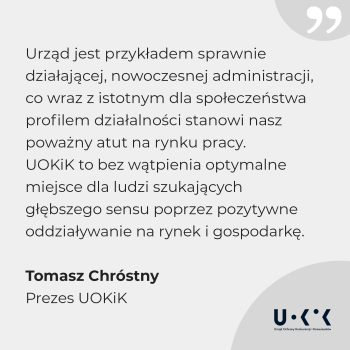 – Urząd jest przykładem sprawnie działającej, nowoczesnej administracji, co wraz z istotnym dla społeczeństwa profilem działalności stanowi nasz poważny atut na rynku pracy. UOKiK to bez wątpienia optymalne miejsce dla ludzi szukających głębszego sensu poprzez pozytywne oddziaływanie na rynek i gospodarkę – mówi Prezes UOKiK Tomasz Chróstny.
