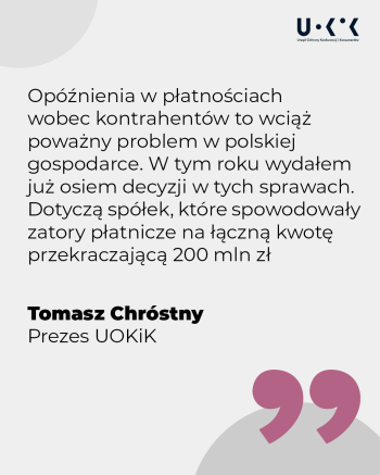 UOKiK przeanalizuje takie zgłoszenie pod kątem nadmiernego opóźniania się ze spełnianiem świadczeń pieniężnych, i będzie monitorował kulturę płatniczą podmiotów, których dotyczy sygnał.