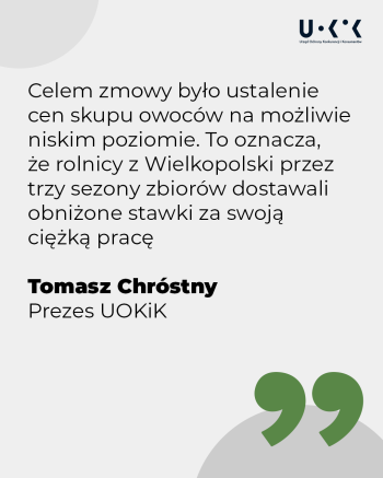 – Celem zmowy było ustalenie cen skupu owoców na możliwie niskim poziomie. To oznacza, że rolnicy z Wielkopolski przez trzy sezony zbiorów dostawali obniżone stawki za swoją ciężką pracę – mówi Prezes UOKiK Tomasz Chróstny.