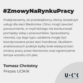 Prezes UOKiK po otrzymanym sygnale i przeprowadzonych analizach wszczął postępowanie wyjaśniające dotyczące rynku pracy. Sprawdza w nich praktyki sieci handlowych Biedronka i Dino oraz firm przewozowych obsługujących tych przedsiębiorców. W lutym i kwietniu br. za zgodą sądu i w asyście funkcjonariuszy Policji pracownicy UOKiK przeszukali siedziby spółek Jeronimo Martins Polska, Dino Polska oraz firm transportowych. Trwa analiza zebranych materiałów.