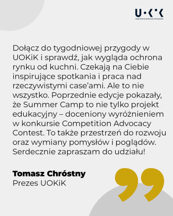 – Stawiasz na praktyczną wiedzę i nowoczesne spojrzenie na ochronę konkurencji? Dołącz do tygodniowej przygody w UOKiK i sprawdź, jak wygląda ochrona rynku od kuchni. Czekają na Ciebie inspirujące spotkania i praca nad rzeczywistymi case’ami. Ale to nie wszystko. Poprzednie edycje pokazały, że Summer Camp to nie tylko projekt edukacyjny – doceniony wyróżnieniem w konkursie Competition Advocacy Contest. To także przestrzeń do rozwoju oraz wymiany pomysłów i poglądów. Serdecznie zapraszam do udziału! – mówi Prezes UOKiK Tomasz Chróstny.
