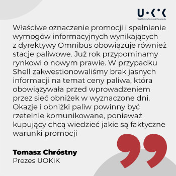 - Właściwe oznaczenie promocji i spełnienie wymogów informacyjnych wynikających z dyrektywy Omnibus obowiązuje również stacje paliwowe. Już rok przypominamy rynkowi o nowym prawie. W przypadku Shell zakwestionowaliśmy brak jasnych informacji na temat ceny paliwa, która obowiązywała przed wprowadzeniem przez sieć obniżek w wyznaczone dni. Okazje i obniżki paliw powinny być rzetelnie komunikowane, ponieważ kupujący chcą wiedzieć jakie są faktyczne warunki promocji – mówi Prezes UOKiK Tomasz Chróstny.