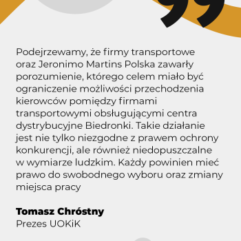 – Podejrzewamy, że firmy transportowe oraz Jeronimo Martins Polska zawarły porozumienie, którego celem miało być ograniczenie możliwości przechodzenia kierowców pomiędzy firmami transportowymi obsługującymi centra dystrybucyjne Biedronki. Tym samym przedsiębiorcy mogli chcieć uniknąć wzajemnego „podkupywania” sobie pracowników. Takie działanie jest nie tylko niezgodne z prawem ochrony konkurencji, ale również niedopuszczalne w wymiarze ludzkim. Każdy powinien mieć prawo do swobodnego wyboru oraz zmiany miejsca pracy – mówi Prezes UOKiK Tomasz Chróstny.