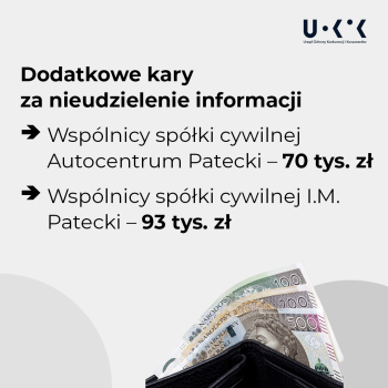 Dodatkowo Prezes UOKIK wydał dwie decyzje, w których nałożył łącznie 70 tys. zł na wspólników spółki cywilnej Autocentrum Patecki oraz łącznie 93 tys. zł na wspólników spółki cywilnej Auto-Centrum I.M. Patecki za nieudzielenie informacji w trakcie postępowania. Przedsiębiorcy nie dostarczyli dokumentów żądanych przez Prezesa UOKiK, dotyczących m.in. wysokości ich obrotów. Maksymalna kara za nieudzielenie informacji żądanych przez organ antymonopolowy wynosi 3 proc. rocznego obrotu przedsiębiorcy.