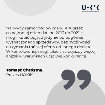– Przeprowadzone postępowanie wykazało, że spółka KIA Polska zawarła zmowę cenową i podzieliła rynek razem z dealerami jej samochodów. Zgodnie z założeniami porozumienia nabywcy samochodów marki KIA przez co najmniej osiem lat, od 2013 do 2021 r., mogli kupić pojazd jedynie od odgórnie wyznaczonego sprzedawcy, bez możliwości otrzymania tańszej oferty od innego dealera. W konsekwencji mogli płacić za pojazdy więcej, aniżeli w warunkach uczciwej konkurencji – mówi Prezes UOKiK Tomasz Chróstny.
